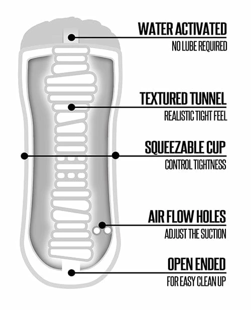 No Lube required – water activated shower stroker. Squeezable masturbation cup. Use Stroker alone or in cup. Feels so real tight tunnel. Dual air holes adjust suction. Extra long hang cord for shower. Easy clean open ended sleeve. Body safe and phthalate free.