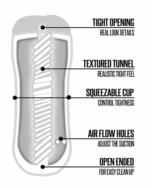 Rinse and repeat. Add lube, stroke, rinse and repeat. Realistic look and feel. Reusable and long lasting stroker. Tight textured tunnel. Super stretchy and waterproof. Use sleeve independently or in cup. Easy to use and easy to clean. Phthalate free and body safe.