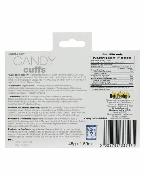 The sweetest cuffs! The Candy Cuffs are made with 1.59-ounce of tasty candy. The cuffs slip over most wrist sizes and allow for a tasty restraint. Eat your way out of submission!