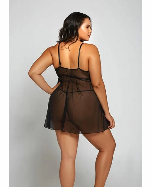 Steal all your sweetie’s kisses in this romantic plus size babydoll set featuring sheer underwire cups, strappy chest detail with a hook and eye front closure, adjustable spaghetti straps, a sheer open mesh bodice, and a matching G-string panty.