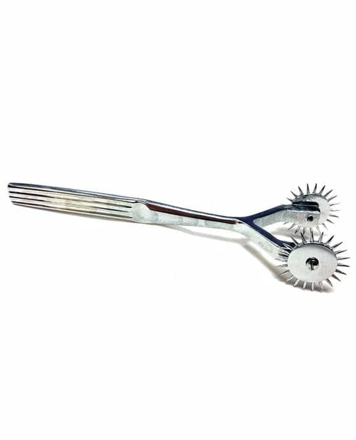 A great medical device used for sensory stimulation, pain/pleasure play, and/or teasing. Contains two spinning pinwheel heads, one on each prong. Material: Nickel Plated.