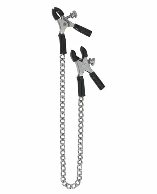 Got big nipples? Then you need some big nipple clamps! Get even more pleasure with these extra large silver clips, designed to accommodate those who are well equipped in the upper erogenous zones. Totally adjustable, these clip-on clamps can be tightened or loosened depending on your pain and pleasure thresholds. A chain attaches the pair for further pressure and stimulation. Coated tips and grips make these easy to put on and remove.