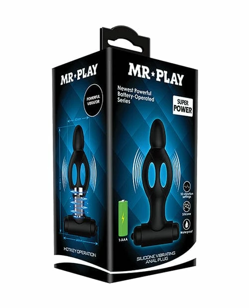 Show your anus some love with the Mr. Play Black Silicone Vibrating Butt Plug. The ultimate in anal play, take your pleasure to the next level with this premium toy. This stylish matte-black plug features a soft bulbous tip with cutaway design for smooth insertions. Press the coordinating bullet and cycle through 10 vibration modes, each one designed to tease you to an orgasmic finish.