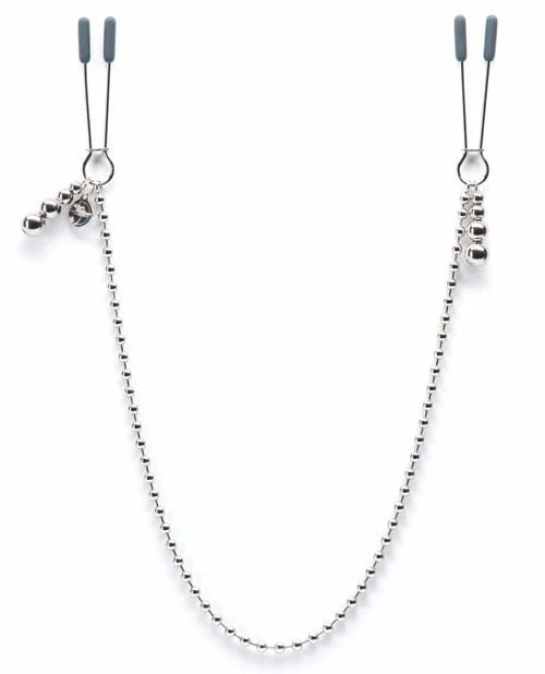 Adjustable nipple clamps fitted on a beaded chain. Clamps’ gentle pinch offers teasing pleasure, while the chain can be tugged for added stimulation during play. Nickel-free metal clamps and chain with silicone-tipped clamps for cushioning comfort. Designed for couples. Comes with a satin storage bag. From Lovehoney.