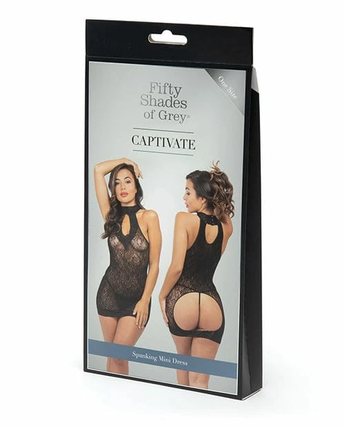 In celebration of a decade of erotic discovery and fulfilment, the Fifty Shades of Grey Official Pleasure Collection invites you to immerse yourself in the Fifty Shades experience. Delicate floral lace mini dress with revealing cut-out for spanking fun. Seamless stretch and short, revealing hemline..