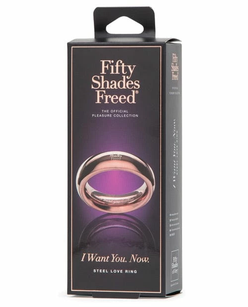 Fifty Shades Freed rigid steel love ring. 160g weight offers satisfying stretch and sensation. Beveled edge and smooth finish offer comfortable wear. Nickel-free, temperature-responsive and waterproof. Makes a stunning gift or addition to a ‘forever’ sex toy collection.