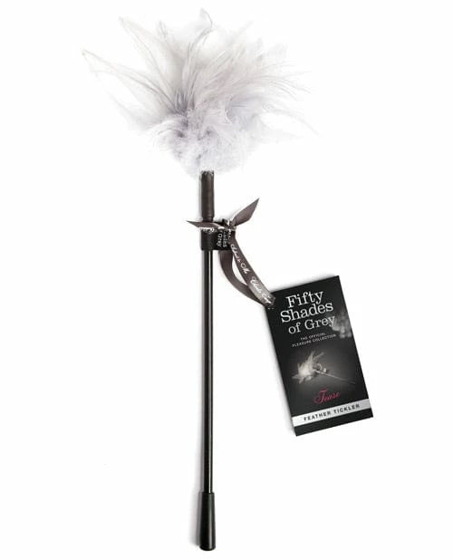 Fifty Shades of Grey Tease Feather Tickler. Allow your arousal to mount slowly under the expert touch of this soft feather tickler. Caressing your skin to attention as it teases your flesh, the plume of feathers leaves a trail of goosebumps in its wake to increase your sensitivity and excitement. “Christian trails the soft feathers over my stomach and breasts as I become captured by my desire, needing more and more. He continues to tease my naked skin, smirking with each titillating stroke.” – Ana Steele. Prolong lust and let pleasure build at an achingly slow pace as you enjoy the sensual touch of soft feathers teasing and tickling your skin. Making every touch and kiss feel more exciting, each stroke sends chills up your spine and leads your body to twist and arch with the anticipation of sexual pleasure. Full body titillation comes easily thanks to the long and slender handle which adds additional reach for the feathers. Stroke from the cheeks to the toes in a single motion without having to unlock lips, making sensory play feel more intimate and exciting. Best enjoyed with a blindfold as a prelude to more intense stimulation, a feather tickler can be enjoyed as part of bedroom bondage or to simply excite your lover before play. Part of the Fifty Shades of Grey The Official Pleasure Collection approved by author E L James, this seductive feather tickler is the ideal erotic gift for fans of the trilogy. Length: 14.5″. Material: feather.