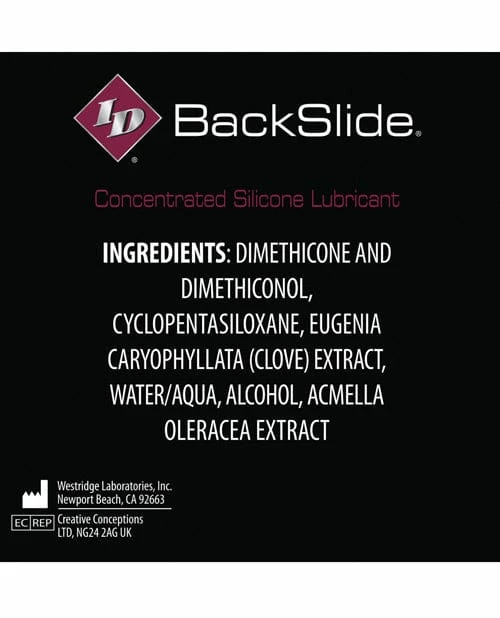 BackSlide is one of ID’s most creative formulas because it was made with a specific use in mind. We’ve spent two years developing BackSlide to create this uniquely blended formula to make every anal experience more comfortable and pleasurable. ID BackSlide’s special silicone-based formula includes clove extract and spilanthes extract, which provides a natural, muscle relaxing effect. BackSlide appeals to all genders and the thick, cushiony texture and feel are unlike any other anal lubricant on the market. Latex compatible, silicone-based, thick and cushiony texture. Ingredients: Dimethicone And Dimethiconol, Cyclopentasiloxane, Eugenia Caryophyllata (Clove) Extract, Water, Alcohol, Acmella Oleracea Extract. 0.27 fl oz. tube – box of 4.