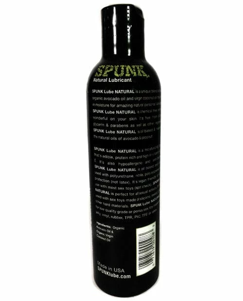 Spunk Natural Lube is a unique blend of edible, virgin coconut oil & organic avocado oil that locks in moisture for amazing natural personal lubrication. Spunk Natural Lube is free from silicone, glycerin & parabens as well as other ingredients. It’s chemical free and feels wonderful on your skin. Spunk Natural Lube is oil based & made from the natural oils of coconut & avocado. Spunk Natural Lube is a moisturizing sex oil that’s edible, protein rich and high in vitamin A, D & E. It’s also hypoallergenic and anti-bacterial. SPUNK Lube NATURAL is oil based and can be used with polyurethane, nitrile, polyisoprene & CF2 protection (not latex). It’s vegan friendly & safe to use with most sex toys (spot check). SPUNK Lube NATURAL is perfect for all sexual activity. It can be used with sex toys made of silicone, metal, glass or other hard materials. SPUNK Lube NATURAL isn’t for low quality grade or porous sex toy materials like jelly, vinyl, rubber, TPR, PVC, TPE or latex. 2 oz.