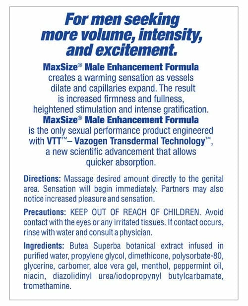 MaxSize Cream creates a warming sensation as vessels dilate and capillaries expand. The result is increased firmness and fullness, heightened stimulation and intense gratification. MaxSize Cream is the only sexual performance product engineered with VTT – Vazogen Transdermal Technology, a new scientific advancement that allows quicker absorption. Make it bigger!