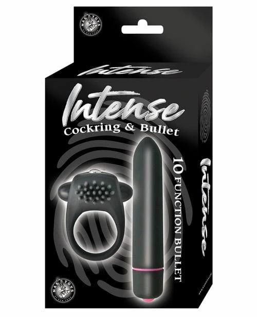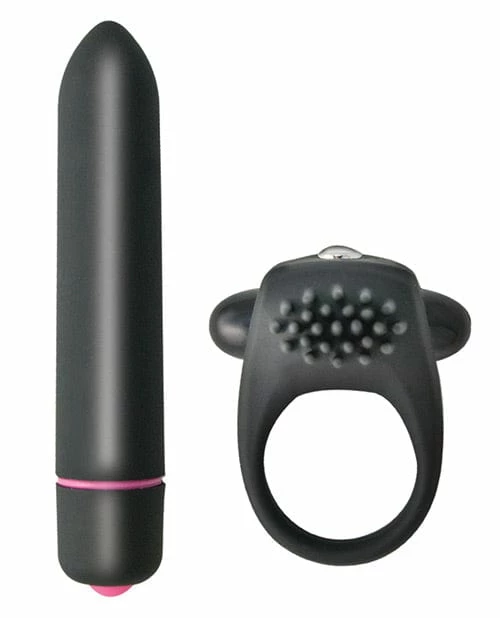 Intense cockring and bullet. 10 function bullet. Vibrating Cock Ring. Couple friendly kit. Discreetly quiet. Waterproof. Phthalates free Color: Black Material: Bullets – ABS, Cockring – Silicone Length: Bullet vibe – 3.5″, Cockring – 2.125″ 1 AAA battery – bullet vibe, 2 LR41 batteries – cockring, all included