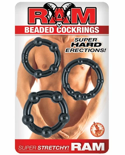 Ram Beaded Cockrings from Nasstoys. 3 Cockring sizes. Super stretchy. For super hard erections! Waterproof. Phthalates free. Materials: TPR. Diameters: Small Ring -1.19″, Medium Ring -1.25″, Large Ring -1.5″.