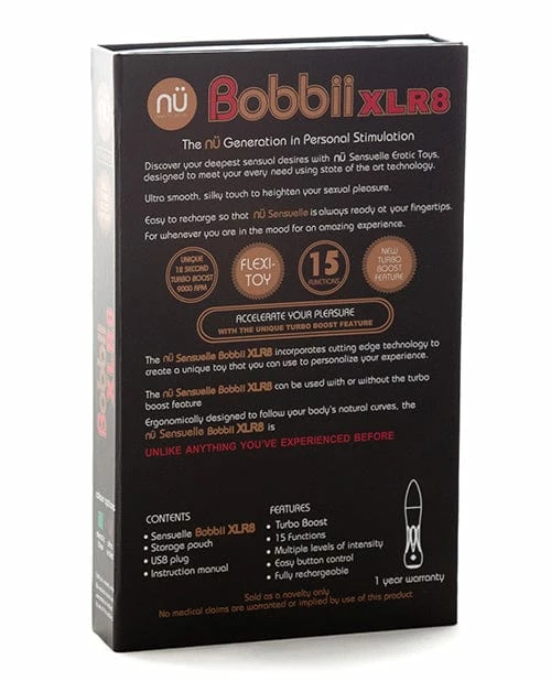 Nu Sensuelle Bobbii XLR8 Purple Vibrator. Accelerate your pleasure with the unique turbo boost. Unique 12 second turbo boost. USB Rechargeable vibrator features 15 functions of deep throbbing and pulsating action. Plus pulsating action. Plus this power packed bullet is also flexible so you can adjust it to your unique shape. Ultra smooth, silky, sensual touch in a flexible design. Waterproof. 1 year warranty.