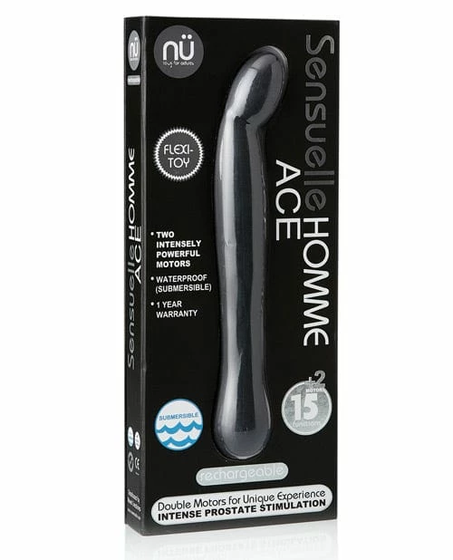 Nu Sensuelle Homme Ace Black Vibrator is a flexi toy from Nu Sensuelle Vibrator features 2 intensely powerful motors. 15 vibration functions. Waterproof vibrations. Submersible. USB Rechargeable. Double motors provide a unique experience with intense prostate stimulation. 1 Year Warranty.