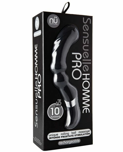 Nu Sensuelle Homme Prostate Massager 3 speeds, 10 functions. Unique ball massager located in the textured tip is perfect for p-spot stimulation. Rechargeable. -3 Speeds -10 Functions -Rolling ball tip -Rechargeable USB or wall charge -Medical grade silicone -Charge time = 4 hours -Running time = 60-75 Minutes -Water resistant for cleaning purpose (Not submersible) -1 Year Warranty -Toy bag included