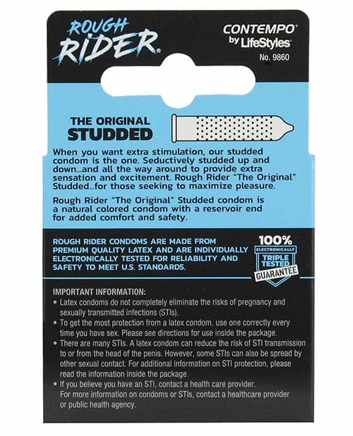 Contempo by Lifestyles Rough Rider Studded Condom. Maximize the pleasure with more stimulating, satisfying studs. Specially lubricated for heightened sensation Natural color and low latex scent.3 condoms per box
