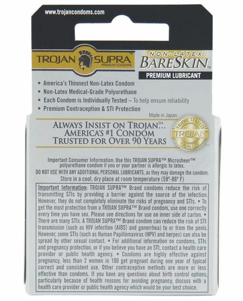 Trojan Supra is made of micro-sheer polyurethane and can be used in place of latex condoms in you or your partner are allergic. Trojan Supra condoms are ultra-thin and strong, compatible with both water-based and oil-based lubricants and clear and odor-free. Comes in box of three.