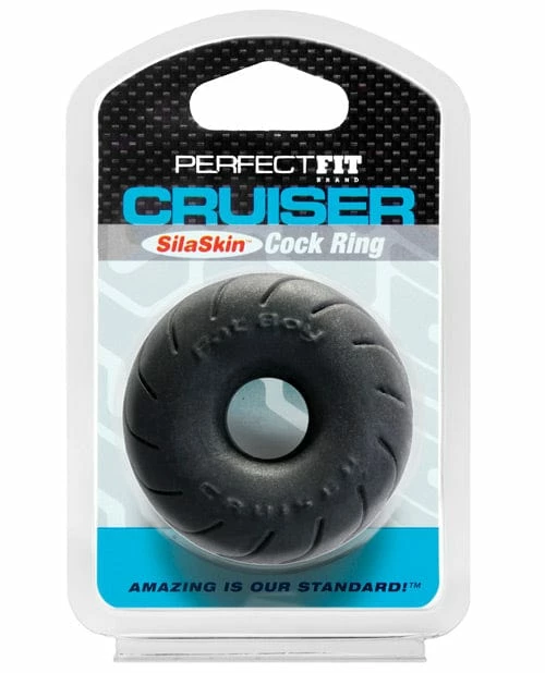 Perfect Fit SilaSkin Cruiser Ring 2.5 inches Black. Cruiser Cock Ring is beefy and built to get the job done. But do not let its bad boy looks put you off. It is super stretchy so it is extremely comfortable while it gently restricts your cock during sex. And, it is beefy design gives you a package that gets notice. The Cruiser design is made with SilaSkin which is our proprietary blend of Thermoplastic Rubber TPR and Silicone for a gentle squeeze. Clean up: wash thoroughly with mild soap and water. Safety safe with water based lubes. This product is not compatible with latex products. Please store separately. Perfect Fit Brand Products are sold, and intended for use strictly as adult novelty toys for entertainment. They are not intended for medical use and have not been clinically tested. No medical claims are warranted or implied by the use of these products.