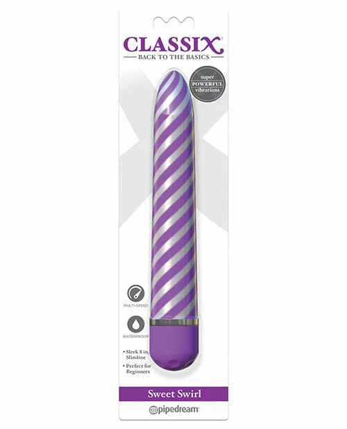 Twist and shout out orgasmic bliss with the Classix Sweet Swirl Vibe! This sleek 8-inch slimline features a brilliant spiraling metallic pattern finish and a powerful motor that will thrust you into ecstasy. With the easy multi-speed dial to control your pleasure! Try it in the spa or shower and turn bath time into fun time! Battery Info: 2 C (Not Included) Length: 8 in. – ( 20.3 cm ) Width: 1.25 in. – ( 3.2 cm )