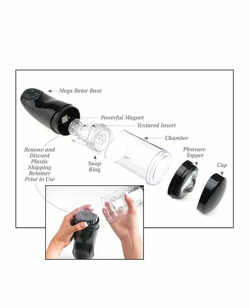 Experience the most advanced, hands-free, USB-rechargeable strokers ever made! The Mega-Bator is the only hands-free masturbator in the world that does all of the work for you while you watch your favorite filth on your mobile device! No more pumping, stroking, or squeezing-just push a button and enjoy explosive results that will make you cum harder than ever before! With no batteries to replace and no messy power cords to get in the way of the fun, this waterproof masturbator is powered by a lithium battery and super-strong motor that delivers amazing thrills and endless pleasure combinations! Unlike ordinary automatic strokers that either spin around or stroke up and down, the advanced Mega-Bator combines both movements for the most mind-blowing sensations ever created. Includes: Mega-Bator, Air Lock Suction Cup, Mobile Device Holder, USB Charging Cord, Free Moist & Toy Cleaner