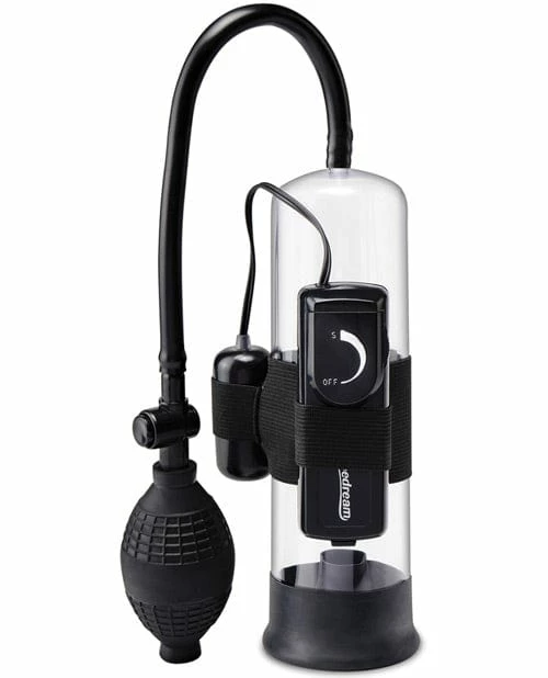 The Beginner’s Vibrating Pump from Pipedream will give you the size and confidence you’ve always dreamt about without any harmful side effects. With each squeeze of the medical-style pump ball, your pleasure rod will grow bigger, thicker, and swell with power. Once you penetrate the smooth, flexible PVC opening, you’ll quickly discover throbbing, rock-hard erections that feel great and last and last with no midway performance letdowns! The clear vacuum tube allows you to watch your cock grow, and the quick-release valve relieves pressure with a push of the button. Choose a speed on the vibrating bullet and enjoy extra stimulation while you pump up your pleasure rod. Beware of imitations! Only this potent pump can deliver results that truly satisfy! To prolong ejaculation, slide the included enhancement ring over your shaft until it’s nice and snug. The tight squeeze will prolong cumming, help maintain your erection, and extend the fun. When you’re done, simply detach the cylinder from the vacuum hose and restore it to like-new quality with Pump Worx Toy Cleaner and warm water.