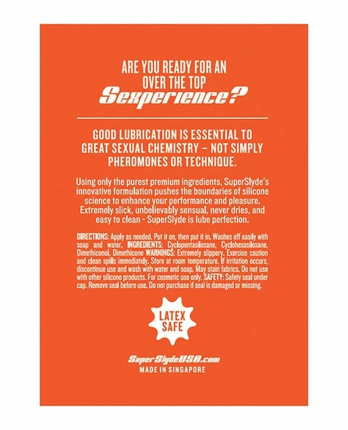 Just a touch of SuperSlyde Silicone lubricant is all you need for long-lasting ease no matter how hard you play. This special blend contains four lubricating silicones that spread thinly and easily filling every crevice of the skin it touches. SuperSlyde stays slick and silky through heat and friction but washes away easily with soap and water. Latex safe. Dermatologically tested, non-irritating, hypoallergenic and suitable for sensitive skin. Ingredients: Cyclopentasiloxane, cyclohexasiloxane, dimethiconol, dimethicone