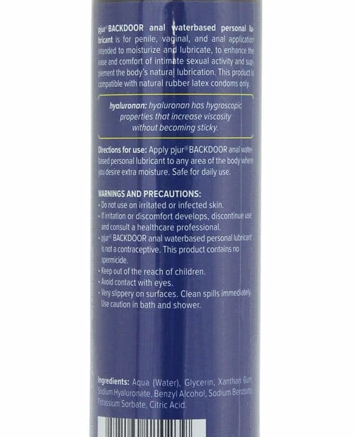 Backdoor Water with the key ingredient comforting hyaluronan is a double-effect water-based anal lubricant created for men who prefer maximum moisture for anal penetration. This performance enhancing personal lubricant is hypoallergenic, latex condom safe, and ideal for daily use. Medical grade ingredients and unique formula make it his most comforting water-based anal lubricant. Developed for him:- provides superior lubrication- enhances performance- and latex condom safe. From Pjur.