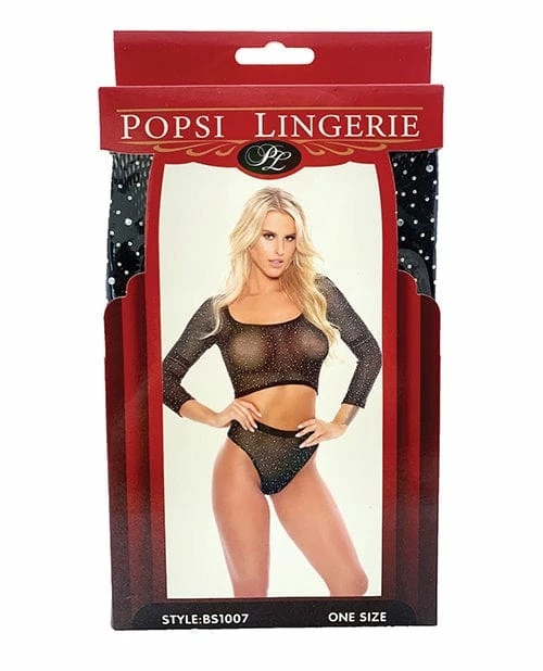 Stand out from the crowd in this stunning fishnet crop top set featuring a scoop neckline, long fitted sleeves, sheer fishnet cups, all over rhinestone studded accents, a cropped hem, and a matching high waisted panty with a thong cut back. From Popsi Lingerie.