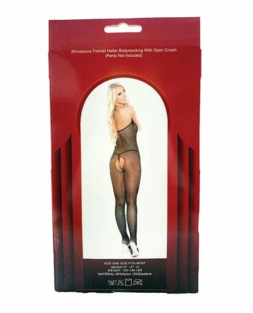 Lure in your lover with this sexy bodystocking featuring a scoop neckline, halter straps, sheer fishnet cups, rhinestone-studded accents, an open crotch panel, an open back, and an over the toe style. (Thong not included.) From Popsi Lingerie.