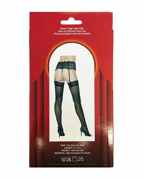 Sheer Thigh High With Stay Up Silicone Lace Top. (Panty And Garter Not Included) From Popsi Lingerie. Material: 95% Polyester. 5% Elastic. OS: Height 5ft – 5ft 10inches. Weight: 100-185 lbs.