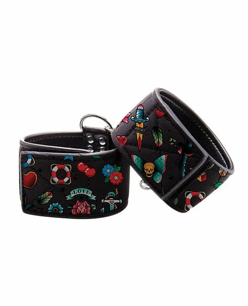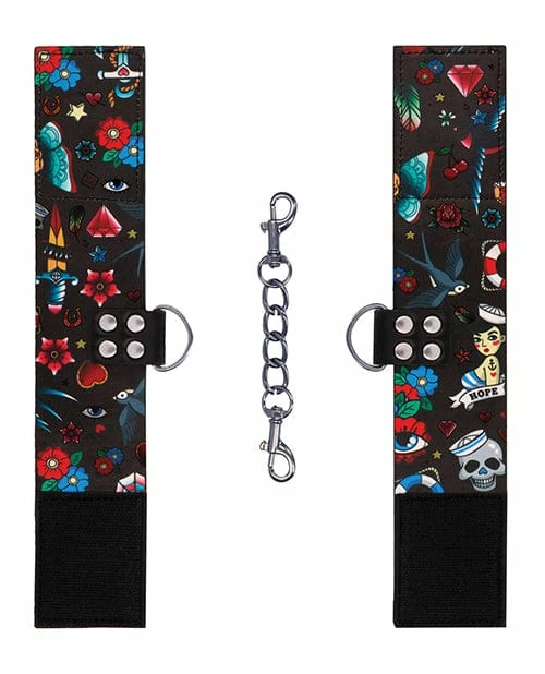 Shots America Kink & BDSM Shots Ouch Old School Tattoo Style Printed Hand Cuffs- Black
