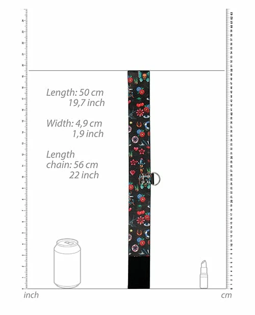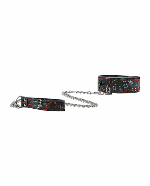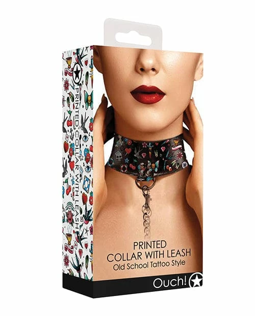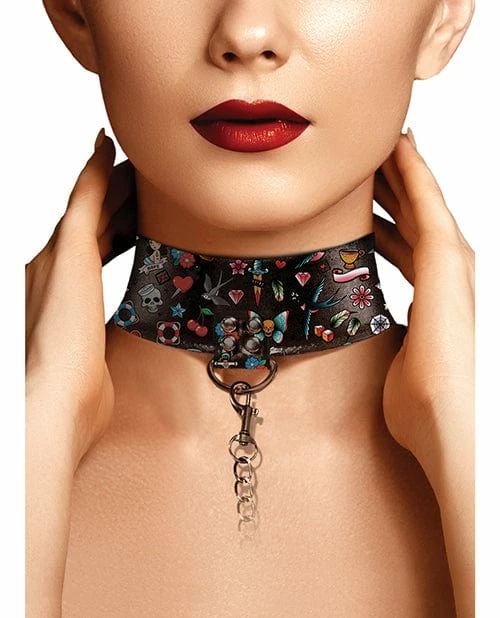 Shots America Shots Ouch Old School Tattoo Style Printed Collar With Leash- Black Kink & BDSM