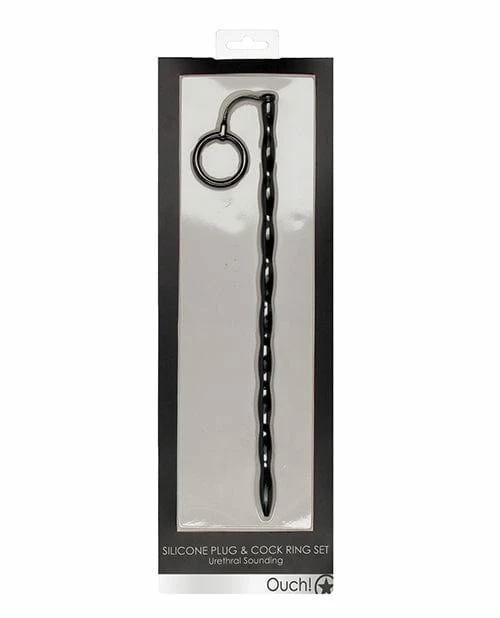 Shots America Shots Ouch Urethral Sounding Silicone Plug & Cock Ring Set – Black