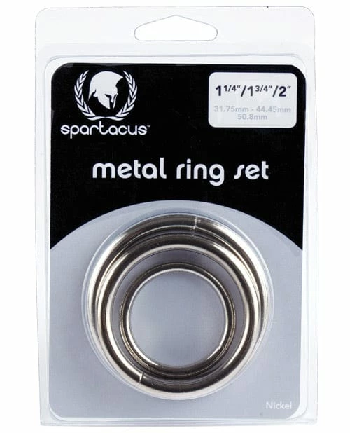 Metal cock ring set from Spartacus. 1.25″ (31.75mm), 1.75″ (44.45mm), 2″ (50.8mm).