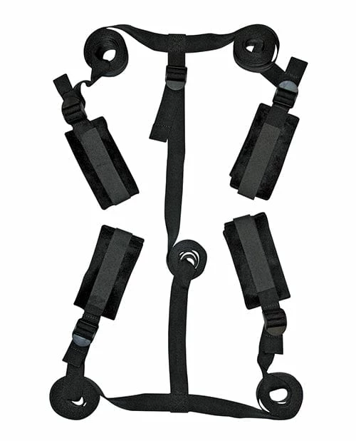 Make any bed your bondage playground with this easy to install kit. No bed posts required! Four soft cuffs are attached to 60 inch adjustable straps. Also includes a 60 inch adjustable connector strap for a secure fit. Portable and perfect for travel.