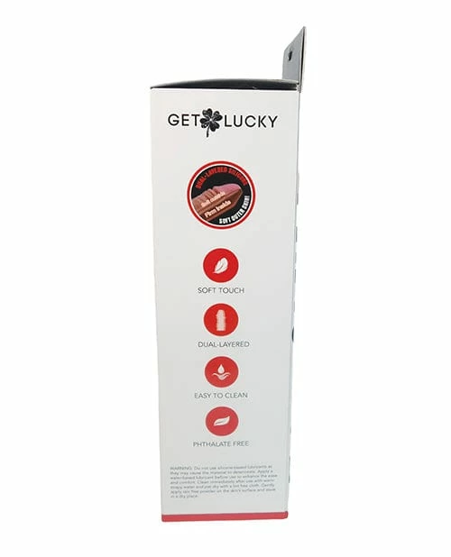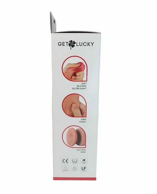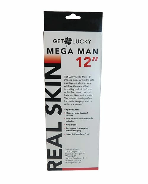 Get Lucky Real Skin Mega Man. 100% Dual layered silicone, Firm interior, ultra-soft exterior. King Sized. Strong suction cup for hands free or harness play. Latex and Phthalate Free .Ultra realistic and natural feel. Waterproof and easy to clean