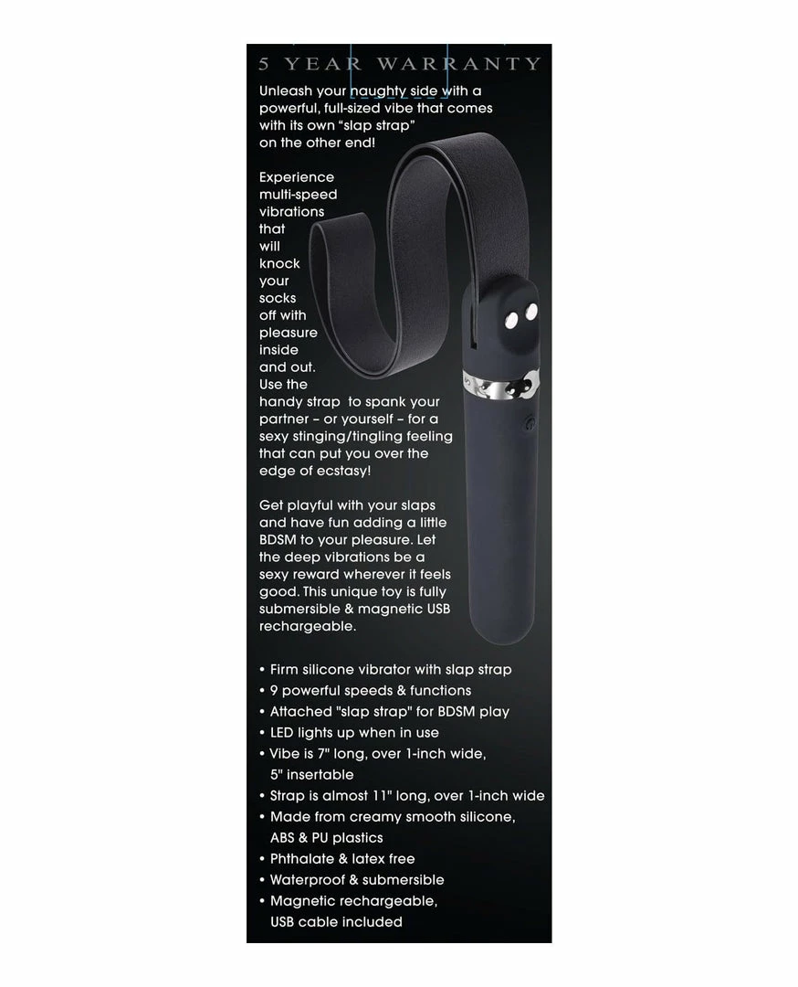 Unleash your naughty side with this long, powerful rigid vibe that doubles as a ‘slap strap’ on the other end! Enjoy multi-speed vibrations that knock your socks off with pleasure inside and out and use the strap end to spank your partner – or yourself! – for that sexy stinging feeling that can really put you over the edge of ecstasy! Get playful with your slaps and have fun adding a little BDSM to your pleasure, using the deep vibrations as a sexy reward wherever feels good. This unique toy is fully water submersible and magnetic USB rechargeable.