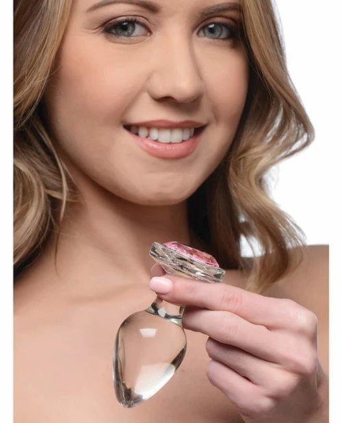Adorn your derriere with a dazzling gem! These glassy Booty Sparks anal plugs are crystal clear and super smooth to provide a solid texture just for your backdoor. Perfect for stretching you anal limits and filling your backdoor to capacity – the rigid body and super smooth surface presses firmly against your walls for an incredible satisfying squeeze! Simply lube up and insert to make that booty sparkle! Enhance your ass with a bright pink gem to entice your lover and prep your booty for some rougher play. The glass material is naturally hygienic and body safe so you can play worry free. Resistant to odors and easy to clean before and after use, these glass gems are a staple to any toy collection. Perfect for temperature play – heat or chill these glass plugs to provide an extra layer of pleasure! This larger plug is 1.6 inches at its widest diameter, with a 3.1 inch insertable length – perfect for anal experts! Smooth and tapered for easy and comfortable entry and compatible with all lubricants so you can play your way. Measurements: Overall length 3.9 inches, insertable length 3.1 inches, diameter at widest point 1.6 inches. Materials: Glass, ABS Plastic.