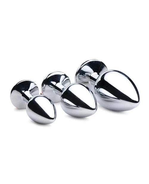 This anal plug set includes three graduated anal plugs, perfect for all skill levels to explore anal play with ease. Tapered and smooth for an easy entry, and made with a nickel-free aluminum alloy for worry free body-safe fill.