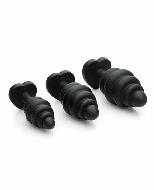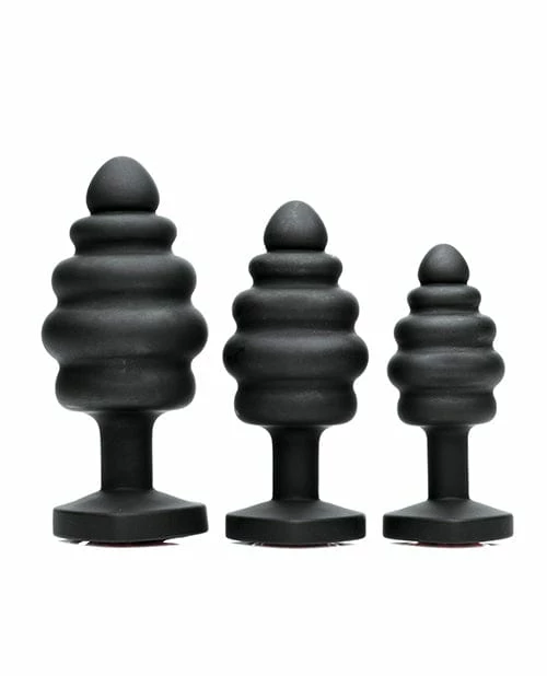 This 3 piece set of premium silicone plugs feature a red heart shaped gem at the base, a tapered tip for easy insertion, and a ribbed design for more sensation. A non-porous and odorless material, it cleans easily and has a silky smooth feel. Perfect for anal training.