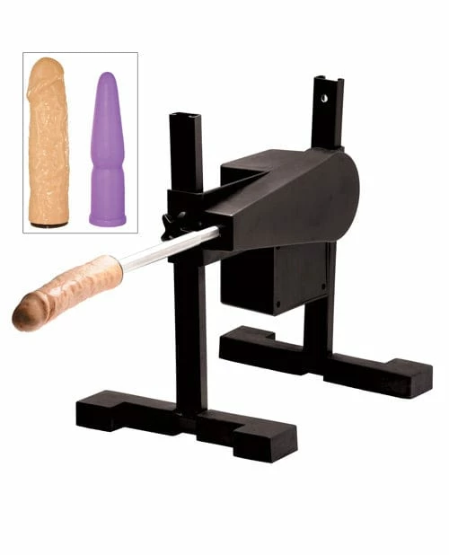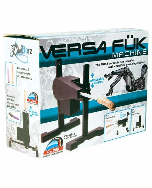 Versa Fuk Sex Machine by Love Botz. Welcome to a truly versatile sex machine that lets you enjoy countless position possibilities. This sexy machine has the ability to be tilted horizontally or vertically so you can be taken from multiple angles! This thrusting powerhouse comes with a silicone dildo remote that allows the user to adjust the speed of penetration and can also stimulate simultaneously. High powered multiple speed strokes are driven by a strong motor and able to teasingly take you, or pound you into submission with a mighty 300 strokes per minute. Comes with an extension rod that adds an additional 8 inches of reach. Grip-tight support pads hold the machine securely in place, and the easy-twist knobs allow to you quickly adjust the angles. Comes with two captivating attachments that lock securely in place- a realistic dildo and a tapered anal penetrator. Power supply input: 100 to 240 volts, 50 to 60Hz, 1.5 Amps; Output: 15 volts, 4 Amps. Horsepower and torque: 0.5 HP, 40 in-lbs, 300RPM. Comes with a 9-foot US power cord. Measurements: Machine: 17.5 inches in length at base, 25 inches total in length including arm, 12.75 inches wide, 19 inches in height; Penis dildo: 7 inches in length, 2 inches in diameter; Anal dildo: 6.25 inches in length, 1.5 inches wide; Vibrating remote: 7.5 inches in total length, 4.5 inches insertable, 1.35 inches in diameter; Stroke length with 7 inch penis: Inner stroke is 3 inches, outer stroke is 10 inches; With extension arm: Inner stroke is 3 inches, outer stroke is 18 inches. Material: Machine: corrosion-resistant steel with black powder coat finish; Realistic dildo: TPR; Anal penetrator: silicone.