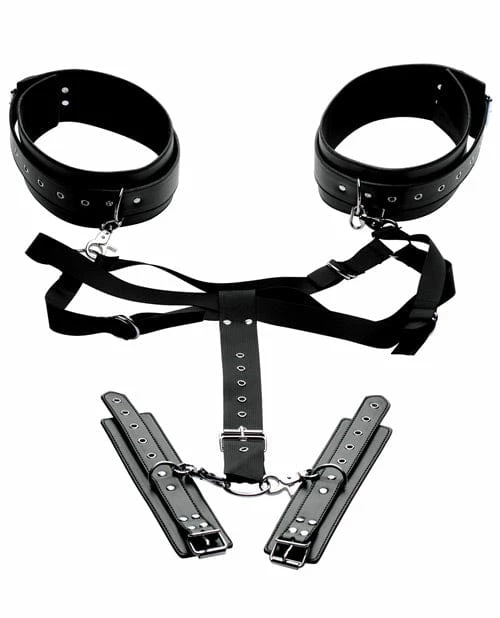 XR Brands Master Series Acquire Easy Access Thigh Harness With Wrist Cuffs – Black Kink & BDSM