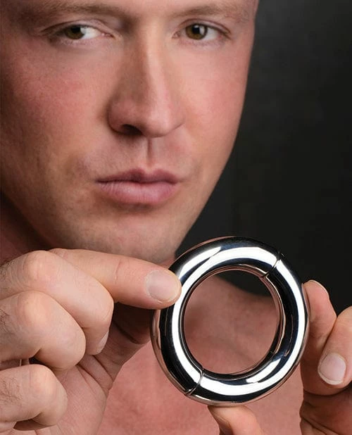 The magnetic closure makes it easy to equip this metal ring on and off your package, opening the door to beginners and experts to the world of metal cock and ball rings with little risk. The stainless steel material is naturally hygienic, nickel-free, and rounded near the closure to prevent pinching when equipping.