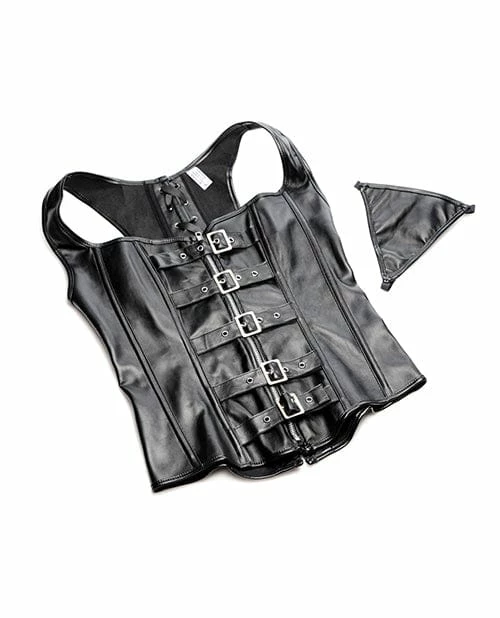 Adopt the domineering aesthetic of a leather mistress with this Lace Up Corset Vest and Thong! Crafted to provide a satisfying hug on your body without discomfort while also displaying a striking silhouette to portray an authoritative persona to fill you with confidence. Lace up, accentuate your curves, and show off your dark side!