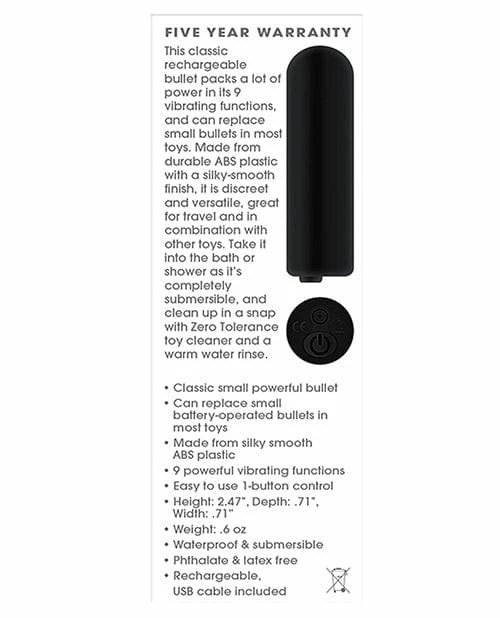 Bullet Buddy. This classic rechargeable bullet packs a lot of power in its 9 vibrating functions, and can replace small bullets in most toys. Made from durable ABS plastic with a silky-smooth finish, it is discreet and versatile, great for travel and in combination with other toys. Take it into the bath or shower as it’s completely submersible, and clean up in a snap with ZT toy cleaner and a warm water rinse. Can replace small battery-operated bullets in most toys. Made from silky smooth ABS plastic .9 powerful vibrating functions. Easy to use 1-button control. Height: 2.47″, Depth: .71″, Width: .71″ .Waterproof & submersible. Rechargeable, USB cable included. Five year warranty.