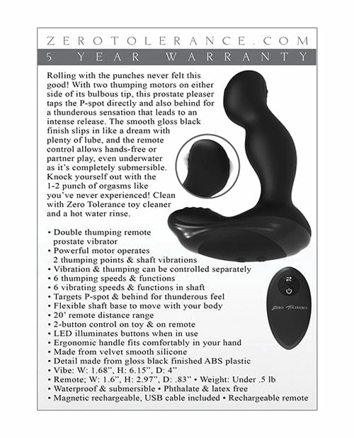 Rolling with the punches never felt this good! With two thumping motors on either side of its bulbous tip, this prostate pleaser taps the P-spot directly and also behind for a thunderous sensation that leads to an intense release. The smooth gloss black finish slips in like a dream with plenty of lube, and the remote control allows hands-free or partner play, even underwater as it s completely submersible. Knock yourself out with the 1-2 punch of orgasms like you’ve never experienced!